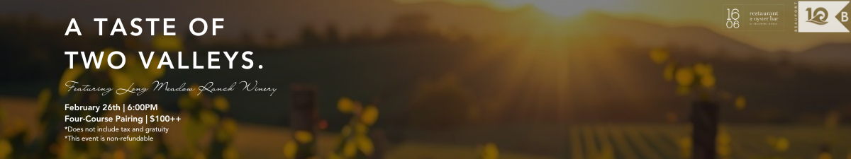 California wine country comes to Beauport Hotel for one perfectly paired evening. Join us on Thursday, February 26th at 6:00PM for A Taste of Two Valleys, a thoughtfully curated four-course wine dinner featuring the celebrated wines of Long Meadow Ranch Winery. This intimate experience highlights the distinct wines of Napa Valley and Anderson Valley, with seasonal pairings including Dover sole, Pan-Seared Duck, Braised Lamb, and a Decadent Dark Chocolate Espresso finale.Tickets are $100 per person (plus tax and gratuity). Reserve your seat for an evening worth savoring. View the wine pairing menu here.
